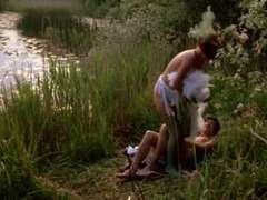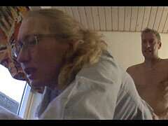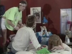 Three hot flight attendants play with a massive Danish cock in sexy foursome group